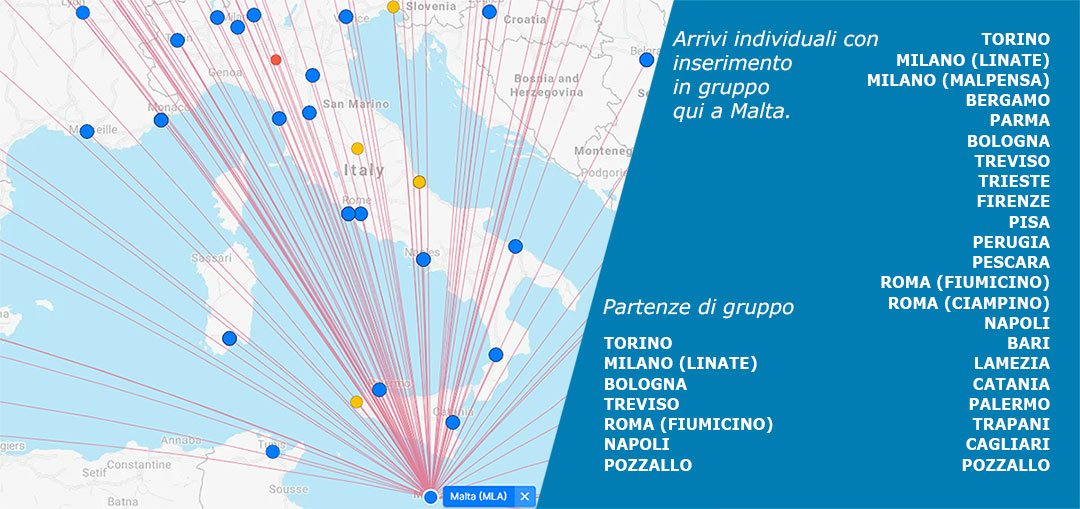 Puoi viaggiare con noi, in gruppo, da tutti gli aeroporti e da Pozzallo ma anche, individualmente da tutti gli aeroporti d'Italia e non solo. Se i nostri gruppi sono già pieni o se non abbiamo un gruppo in partenza dall'aeroporto più comodo o più vicino a te, fai viaggiare i tuoi figli individualmente: dovremo prenotare noi il volo per te, in base a quanto previsto dai bandi degli ultimi anni e dai chiarimenti di INPS. Accoglieremo qui a Malta i tuoi figli anche se viaggeranno individualmente: saranno inseriti in gruppo all'arrivo. Questo è stato sempre ammesso dai bandi ESTATE INPSieme ed è una fantastica novità degli ultimi anni. I tuoi figli possono quindi viaggiare da 21 aeroporti italiani e anche da aeroporti non italiani se si trovano all'estero al momento della partenza.